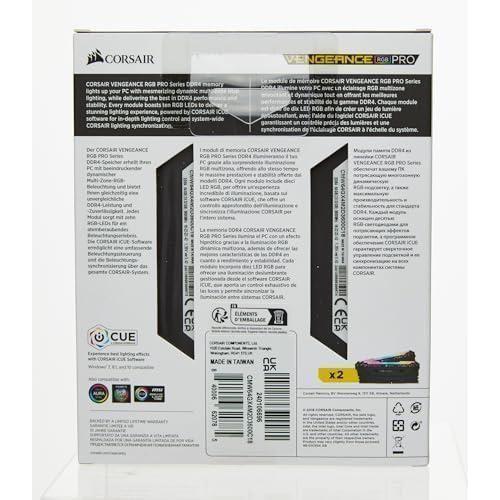 Details: La memoria DDR4 de la serie RGB PRO de CORSAIR VENGEANCE ilumina tu PC con una fascinante iluminación RGB dinámica multizona, mientras que ofrece lo mejor en rendimiento y estabilidad DDR4. Cada módulo cuenta con diez luz LED RGB controlados individualmente, mientras que el diseño sin cables facilita la instalación. Toma el control con el software Corsair iCUE y personaliza completamente la iluminación de cada módulo para que coincida con tu sistema, o sincroniza fácilmente la iluminación en todos tus productos Corsair con Light LINK. La Placa de circuito impreso diseñada a medida proporciona la más alta calidad de señal para obtener el mejor nivel de rendimiento y estabilidad en las placas madre AMD e Intel DDR4 más recientes, mientras que los CI especialmente seleccionados desbloquean la sobreaceleración superior. Teléfono del soporte técnico: 1-888-222-4346, opción 1.