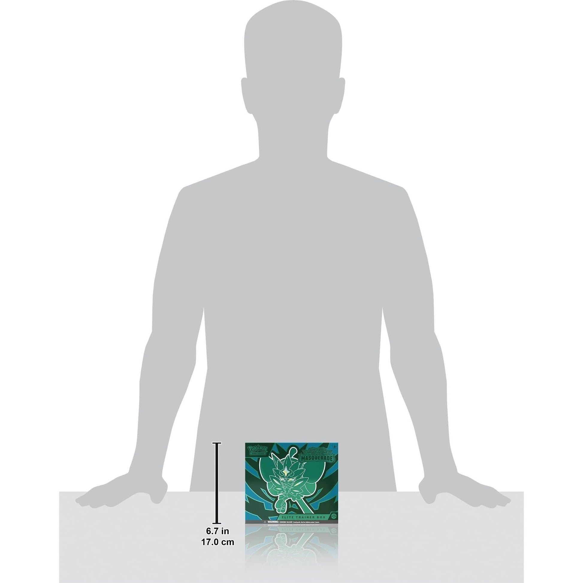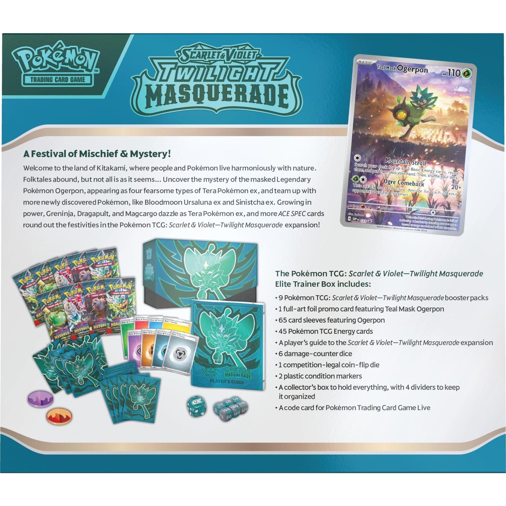 - The Pokémon TCG: Scarlet & Violet—Twilight Masquerade Elite Trainer Box includes 9 Pokémon TCG: Scarlet & Violet—Twilight Masquerade booster packs, 1 full-art foil promo card featuring Teal Mask Ogerpon, and 65 card sleeves featuring Ogerpon.