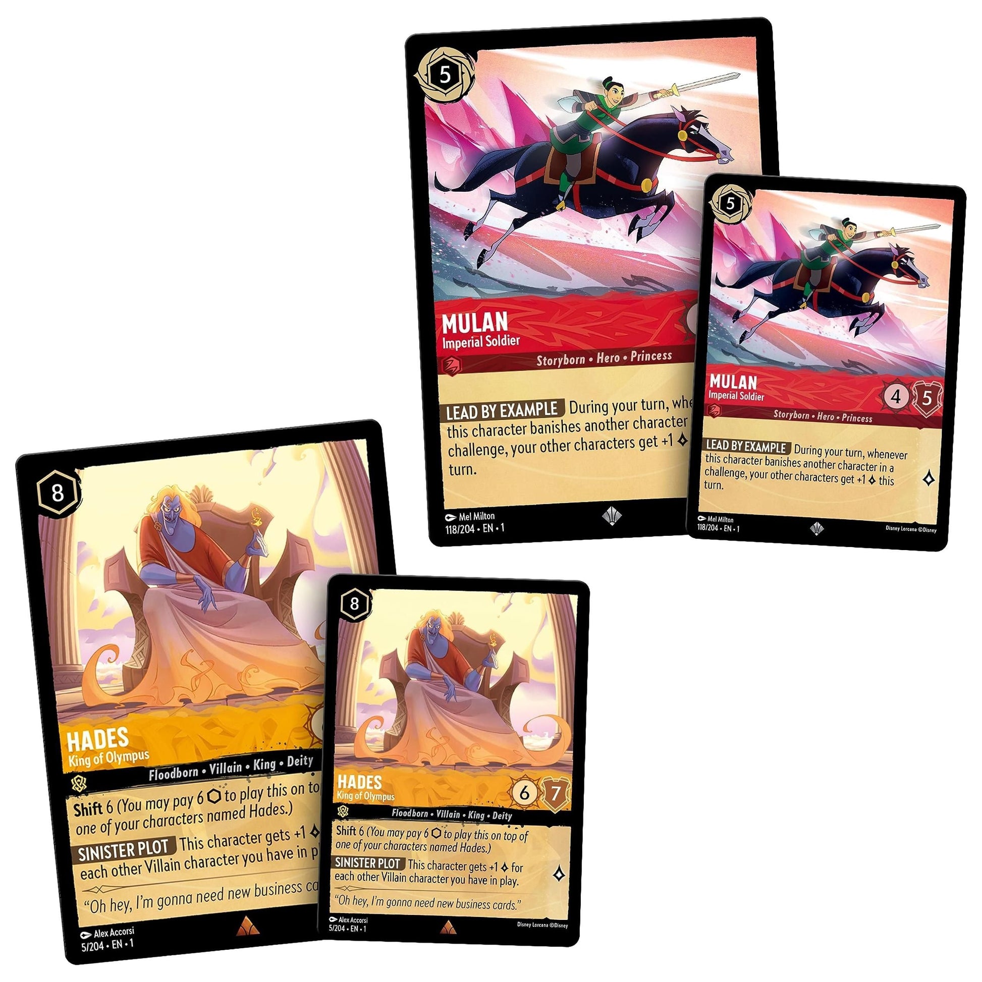 Players can turn up the heat with this gift set! Foil cards featuring Hades – King of Olympus and Mulan – Imperial Soldier bring new options to your decks, and the oversized foil versions are fun to collect and display. The gift set comes with 4 randomized booster packs to quickly enhance your collection and add variety to your decks. Each player needs a Disney Lorcana deck of at least 60 cards to play.