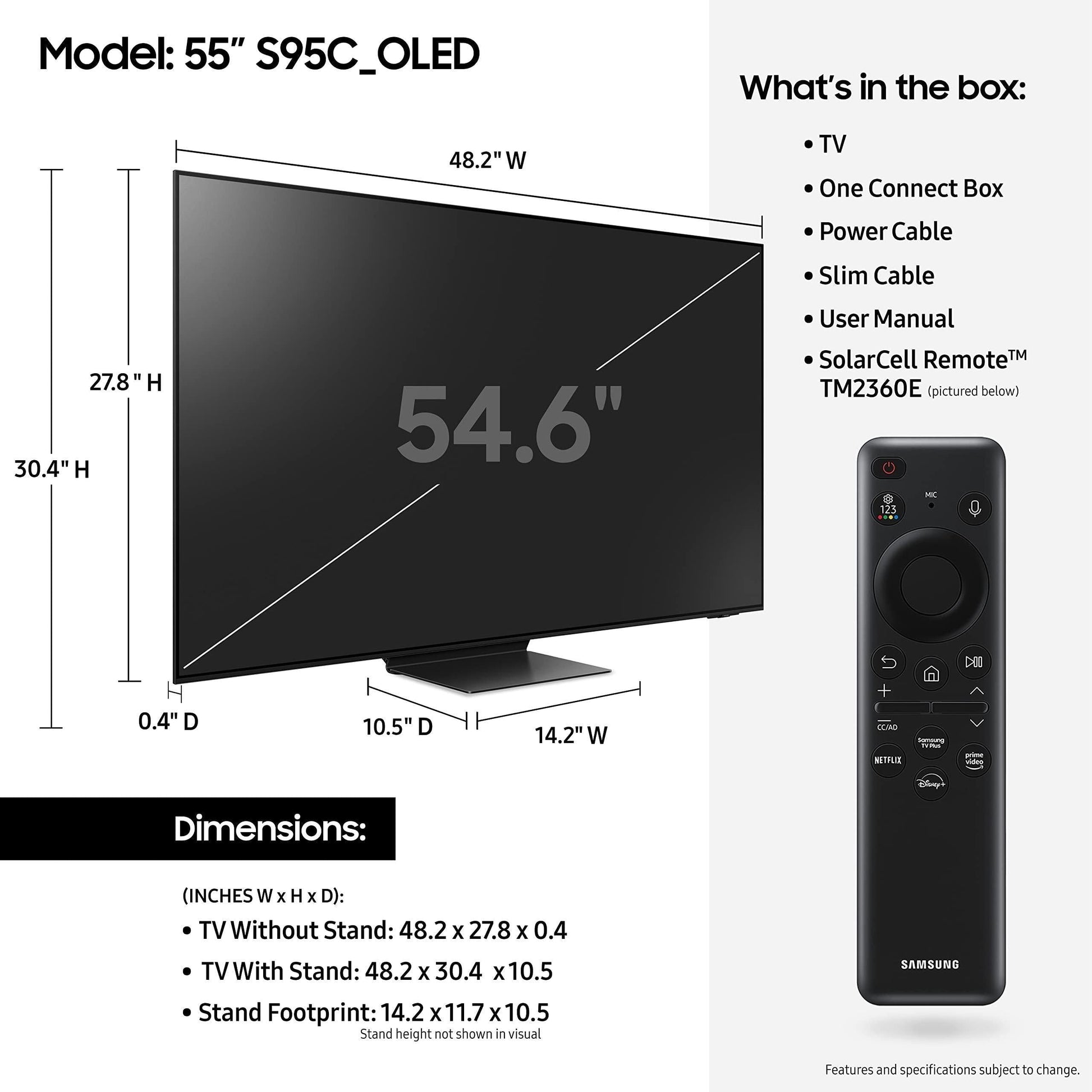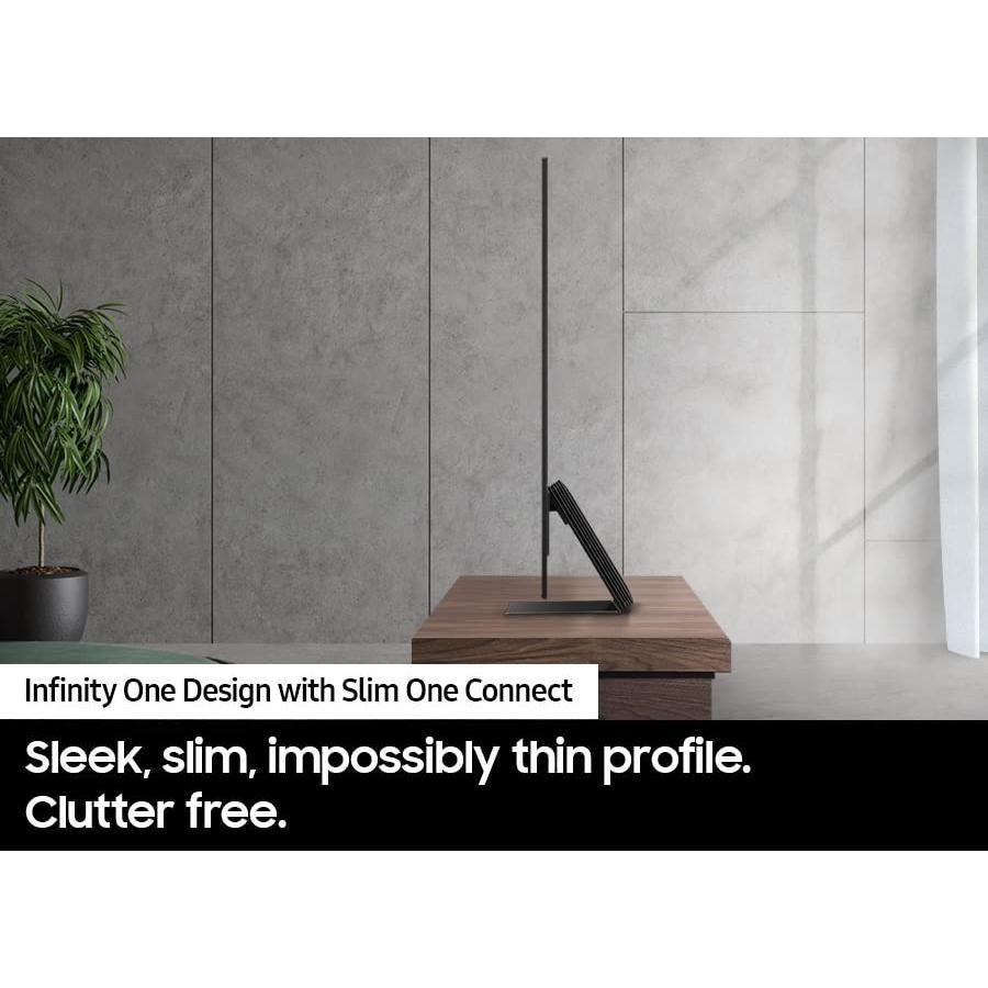 - INFINITY ONE DESIGN w/ SLIM ONE CONNECT: Samsung’s Infinity One Design is sleek, slim and impossibly thin; Its strikingly slender design features modern lines and an attachable Slim One Connect solution to neatly organize cords and cables